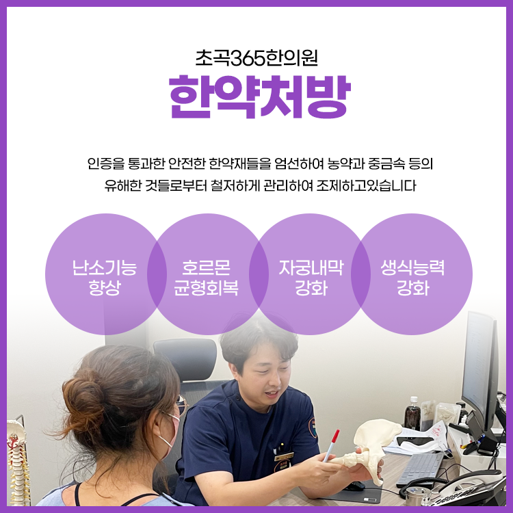 본원은 원활한 자궁 환경 조성을 위해서 침 치료와 약침 치료 그리고 한약 처방을 돕고 있으니 개인에 따른 한방요법 그리고 잘못된 생활 습관 개선을 이룬다면 원하시는 결과에 다가갈 수 있을 것이란 생각이 듭니다. 어떻게 해야 될지 고민을 한다면 혼자서 앓고 있지 말고 본원과 함께 헤쳐나가보셨으면 합니다. 감사합니다.