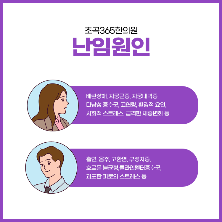 환경적인 요인이나 선천적인 요인 그리고 내부적인 요인 등이 원인이 될 수 있어서 꼼꼼하게 살펴주는 것이 중요한데 혹여 난임이란 소견을 듣고서 좌절할 수도 있겠지만 임신이 어려운 것이지 불가능한 것은 아니므로 포기하지 말고 초곡365한의원을 믿고 헤쳐나가보시길 바라겠습니다. 만약 원인불명이라면 더욱 임신 과정이 중요할 텐데 이러한 경우에는 한의학적인 관점에서 내부에 쌓인 어혈을 원인으로 보기도 합니다.