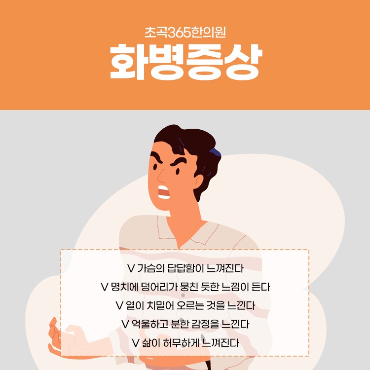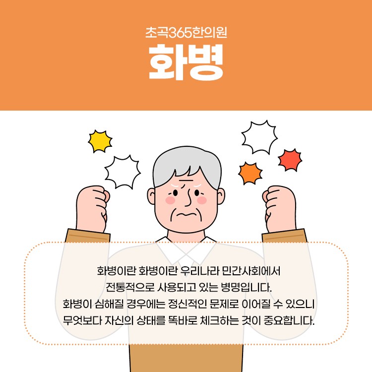 우리는 예상하지 못하는 상황을 마주하기도 하면서 사회 속에 사람들과 지내면 답답하면서 억울한 일들이 생길 수 있습니다. 이러한 순간에 우리는 화병이 날 것 같다고 표현을 하는데요. 본인에게 이런 일들이 자주 일어나면 단순히 순간적인 감정이 아니라 질환은 아닐지 알아봐야 할 것입니다. 이러한 질환들이 왜 일어나는지 꼼꼼히 확인해주는 것이 중요하며 단순하게 자연치유가 되는 문제가 아니라는 것을 인지하고 있어야 될 것입니다.
