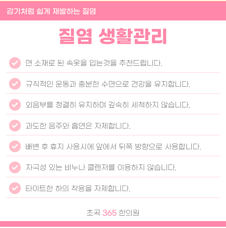 그러니 점점 더 날이 더워지는 요즘, 질염으로 인해 고민이 되신다면 주저말고 초곡 365 한의원에 내원하셔서 증상에 맞는 치료를 받으시길 바랍니다.