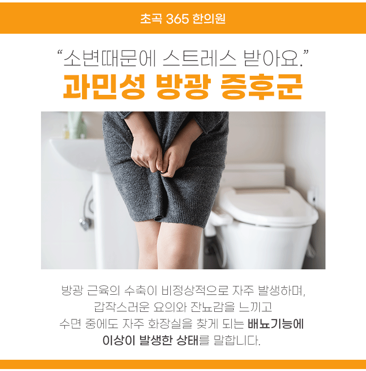 그렇다면 과민성 방광 증후군이란 어떤 질환일까요? 과민성 방광 증후군은 소변을 봐도 시원하지 않은 잔뇨감이 느껴지는 이 질환은 일반적으로 소변을 참기 힘든 증상이 나타납니다. 대부분 200ml에서 300ml 정도의 소변이 방광에 차게되면 요의를 느끼게 되며 정상적인 사람들은 근처에 화장실이 없다해도 어느 정도 시간 동안은 요의를 참을 수 있습니다. 하지만 과민성 방광 증후군 질환을 앓고 계신 분들은 소변이 마려운 증상이 정상인들보다 훨씬 높은 강도로 느껴지기 때문에 금방이라도 소변이 나올 것 같은 불안감에 휩싸이곤 한다고 합니다. 이러한 증상을 절박뇨 라고 말하기도 하며, 치료 없이 방치 한 후 심한 절박뇨로 진행될 경우에는 화장실에 도착하기 전에 소변을 보게 되는 '절박성 요실금'으로 이어지기도 합니다.