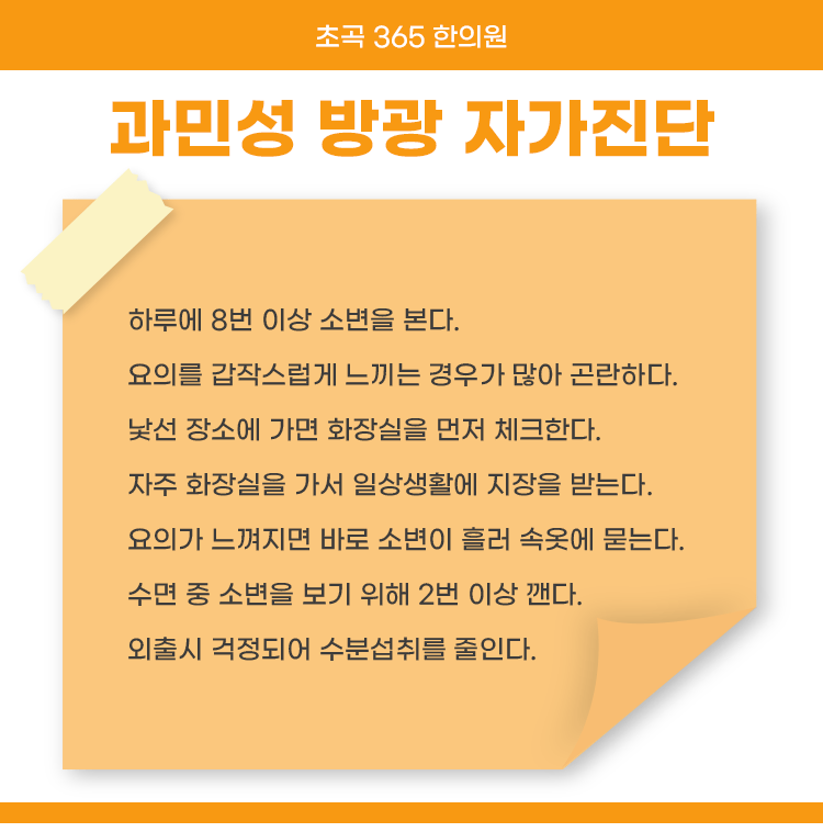 과민성 방광 증후군의 여부는 소변검사를 통해 확인해 볼 수 있습니다. 소변에 염증이 있는 경우라면 항생제 복용을 통해 개선할 수 있지만, 만성화 된 경우라면 좀 더 세심하게 다양한 부분들에 초점을 맞추어 증상에 맞는 치료를 적용할 필요가 있습니다. 일반적으로 소변은 하루에 8~9회 정도 보는 것이 정상이며, 밤에 숙면을 취하는 중에는 소변을 보지 않거나 1회정도 보는 것이 정상입니다. 이보다 소변을 많이 볼 경우나 소변으로 인해 자주 잠에서 깨어나 숙면에 방해받는 경우에는 검사를 통해 정확하게 확인해 본 후 포항 잔뇨감 한의원 초곡 365 한의원에서 본인의 상태에 맞는 치료가 진행되어야 합니다.
