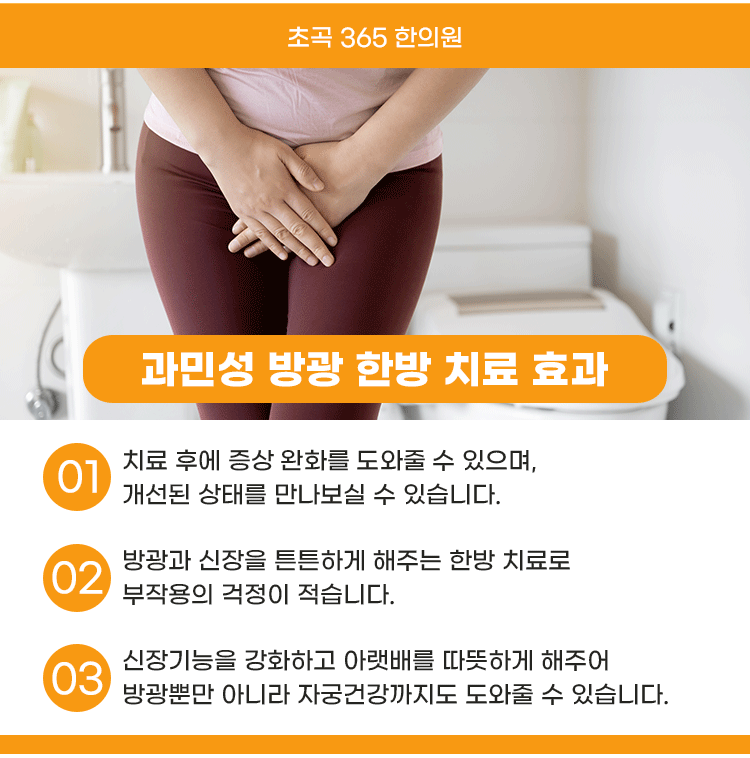 초곡 365 한의원에서는 과민성 방광 증후군의 근본적인 원인에 초점을 맞추어 치료를 도와드리고 있습니다. 방광이 차갑고 약해진 상태이기 때문에 이러한 증상들을 개선해 줄 수 있도록 한방치료가 복합적으로 이루어져 도움을 드릴수 있으며, 침이나 뜸, 한약 등의 한방치료를 통하여 방광에 따뜻한 기운이 돌도록 도와주고 약해진 신장을 보강해 주며 긴장, 스트레스로 인해 뭉쳐있는 기혈을 풀어줌으로써 개선할 수 있도록 도움드리고 있습니다. 그러니 언제든지 초곡 365 한의원에 내원하셔서 불편함을 털어내시길 추천드립니다.