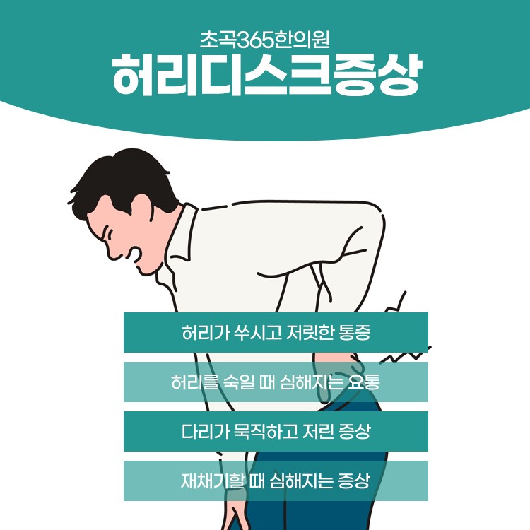 이러한 허리디스크 증상은 일상생활 속에서 많은 불편함을 가져다주기 때문에 빠른 치료가 필요한 질환 중 하나입니다. 허리디스크의 대표적인 증상은 허리가 자주 쑤시고 요통이 느껴지거나 허리와 엉덩이, 다리가 아프고 저릿하거나, 기침이나 재채기를 할 때 통증이 느껴지거나, 하반신이 무겁고 눌리는듯한 느낌이 드는 경우로 볼 수 있습니다. 평상시에 위와 같은 증상이 느껴진다면 방치하지 마시고 본원에 내원하셔서 악화하지 않도록 관리해야 합니다.