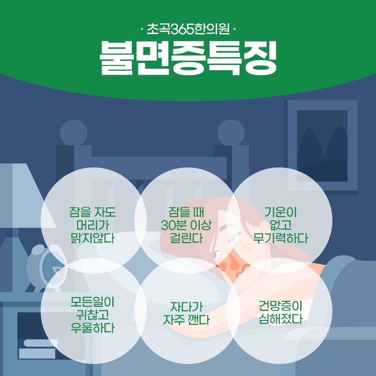 잠을 자지 못한다면 일상생활을 정상적으로 유지하기 힘들어집니다. 잠을 충분히 자지 못한다면 몸의 피로가 누적되고 업무, 학업에 대한 능률과 집중력이 저하되어 일상생활에 큰 문제를 초래하게 됩니다. 불면증을 겪고 있는 분들을 살펴보면 심리적인 문제와 함께 두통, 어지럼증, 과민대장증후군과 같은 신체적인 증상을 동반하고 있습니다.