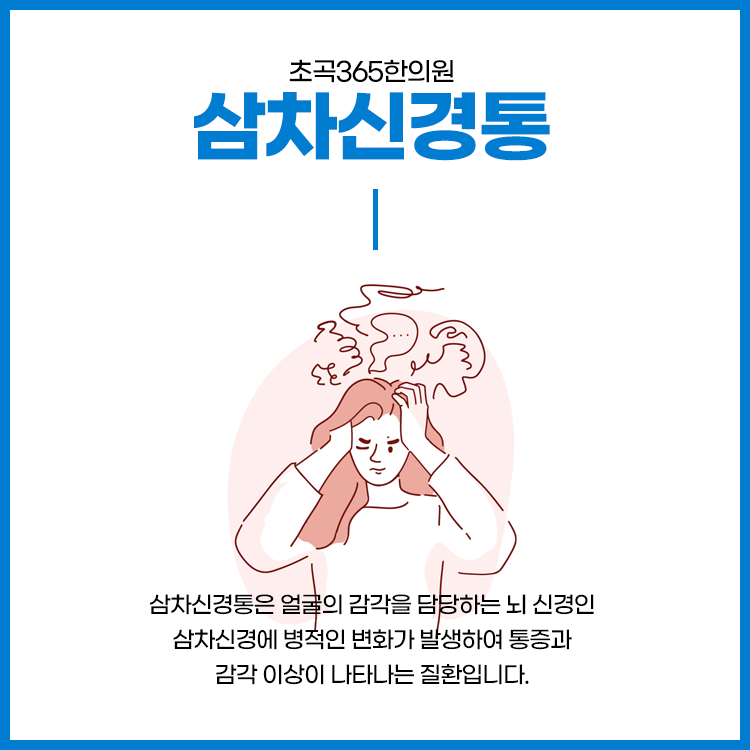 삼차신경통은 얼굴의 감각을 담당하는 뇌 신경인 삼차신경에 병적인 변화가 발생하여 통증과 감각 이상이 나타나는 질환입니다. 안신경, 상악신경, 하악신경 총 세 부분으로 나뉘어있기 때문에 삼차신경이라 합니다. 주요 증상으로는 한쪽 입 주위, 잇몸과 이빨, 뺨, 코 옆, 이마 등을 따라 송곳이나 바늘로 찌르는듯한 극심한 통증이 발생했다가 호전됐다가는 반복적으로 나타납니다.