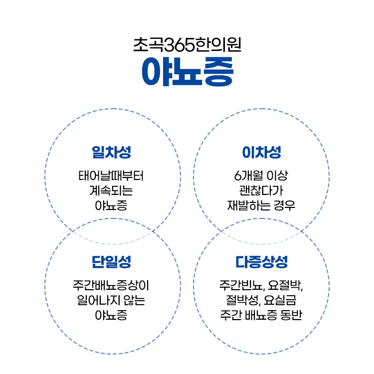 스트레스가 지속되면 잠을 제대로 자지 못해 성장호르몬에도 영향이 가기 때문에 야단치고 꾸짖기보다는 아이의 손을 잡고 두호동 야뇨증 한의원에 내원하시는 게 바람직한 방법입니다. 야뇨증은 종류가 다양합니다. 일차성 야뇨증은 태어나서 계속 야뇨증이 지속되는 경우로 야뇨증의 80% 정도가 일차성에 해당합니다. 이차성 야뇨증은 6개월 이상 소변을 가리다가 다시 야뇨증이 생기는 경우이며 정서적 스트레스, 요로감염증이 의해 생기기도 합니다.
