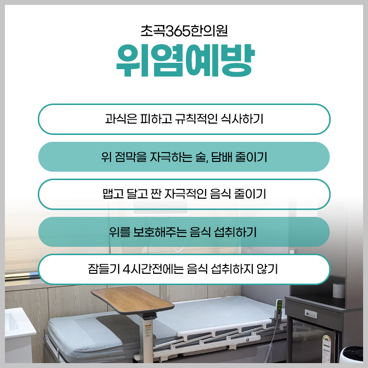 한방치료와 함께 잘못된 생활습관을 개선한다면 해당 질환을 빠르게 치료할 수 있습니다. 소화가 힘든 유제품은 피하는게 좋고, 맵고 짠 자극적인 음식과 기름진 고칼로리 음식도 자제하는것이 좋습니다. 무엇보다도 과식해서는 안되고 정해진 양을 천천히 씹어 먹고 식후에는 가벼운 운동으로 신체활동을 해주면 좋습니다.
