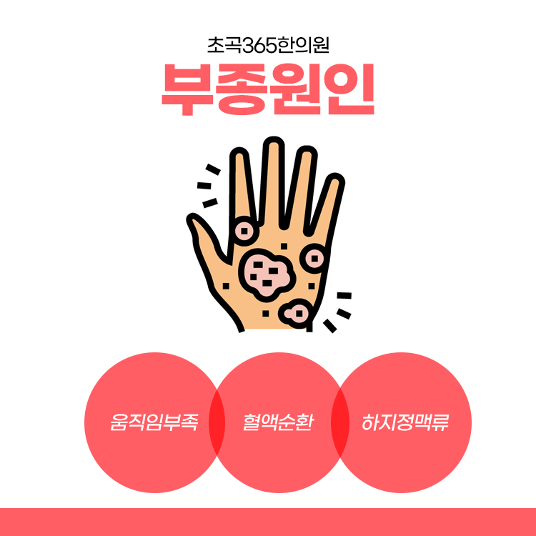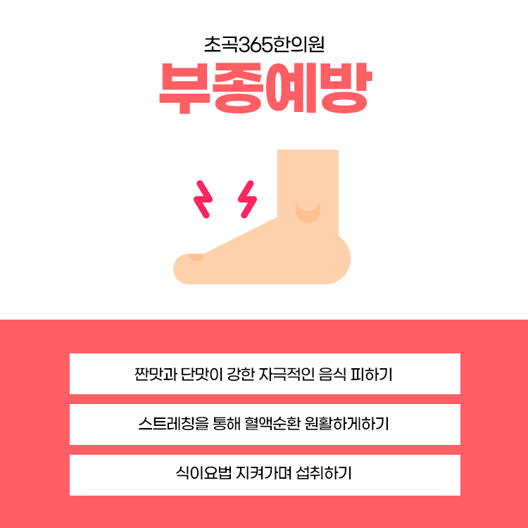 부종이라하면 편하게 신었던 신발이 갑자기 답답하게 끼거나, 바지를 입었을 때 꽉 껴 벗기 힘들거나, 벗었을 때 박음질 자국이 다리에 그대로 남아있거나, 묵직한 느낌이 들기도합니다. 이런 증상이 반복되고 지속된다면 반드시 원인을 파악하여 치료를 시작하시길바랍니다.