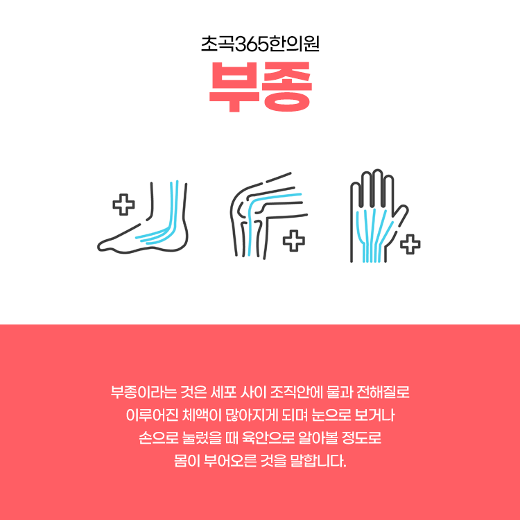부종은 세포 사이 조직내에 물과 전해질로 이루어진 체액이 많아지면서 눈으로 보거나 손으로 눌렀을 때 눈에 띄게 몸이 부어오른 것을 말합니다. 이러한 부종 증상은 다양한 원인에 의해 나타날 수 있기 때문에 부종이라고해서 시간이 흐르면 괜찮아질거라고 방치해서는 안됩니다. 어떠한 이유 때문에 부종이 생긴것인지 원인을 면밀하게 파악하는 것이 바람직합니다.
