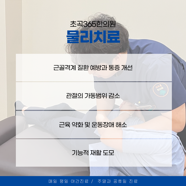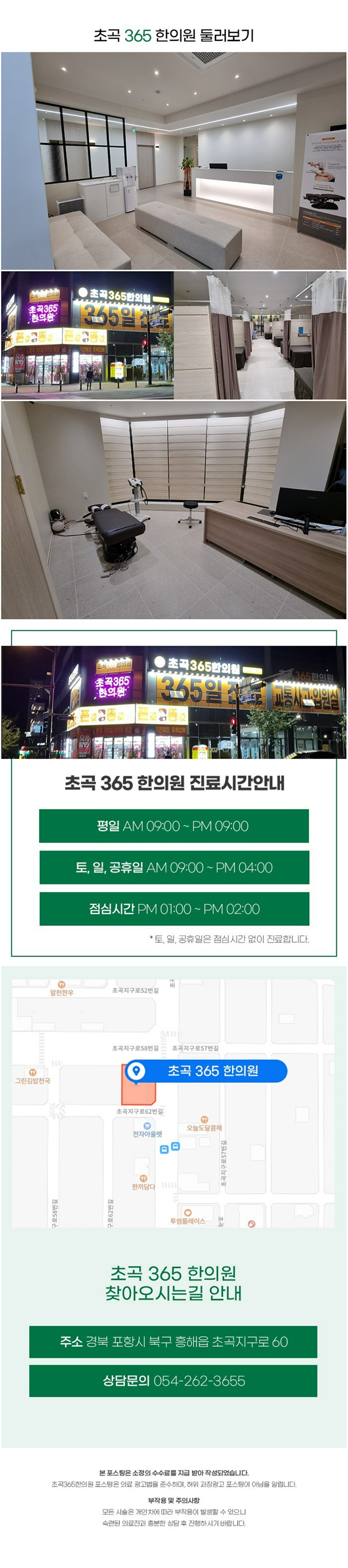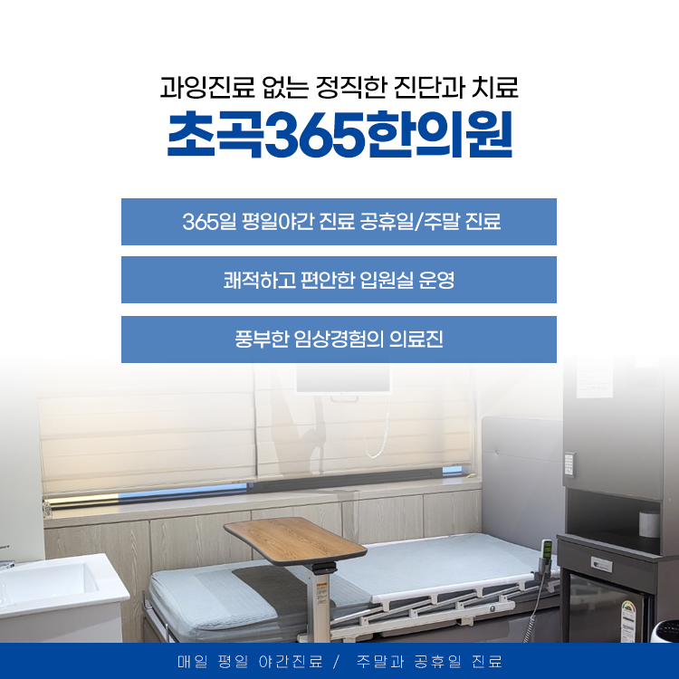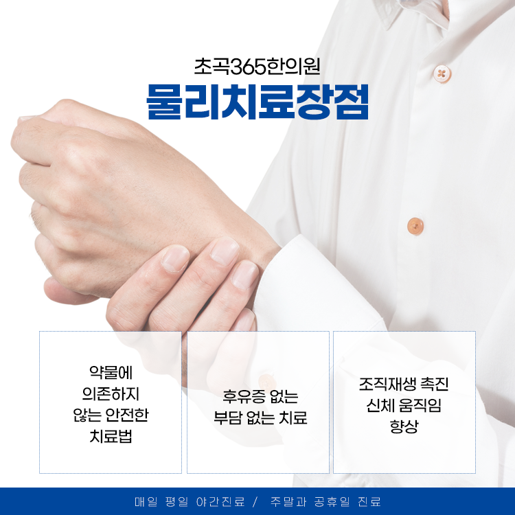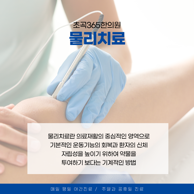 본원에서는 환자분의 건강을 위해 쉼없이 365일 진료를 보고있습니다. 만성통증으로 인해 물리치료를 받고 싶으시다면 초곡365한의원에 내원하셔서 꼼꼼한 진료를 시작하시길바랍니다. 감사합니다.