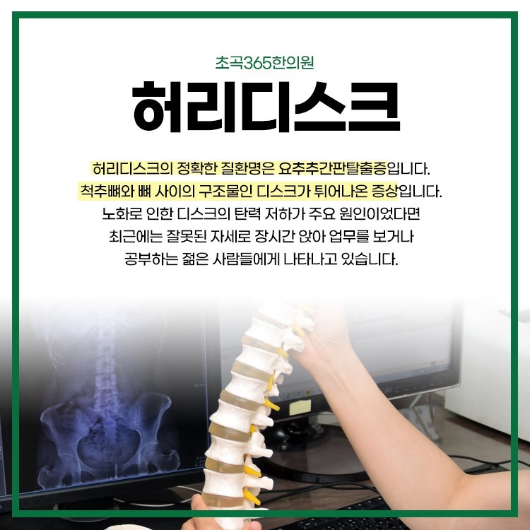 보통은 허리디스크 진단을 받을 때 수술을 생각하시는 분들도 있으시만, 실제로 허리디스크 전체 중에 % 내외로만 수술이 필요할 수 있어 다른 치료법으로도 충분히 회복이 가능할 수가 있기에 초곡365한의원을 통해서 검진을 받아보세요.