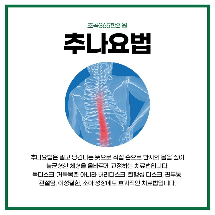본원은 추나요법으로 치료를 진행하기도 하는데 비수술적인 요법으로서 수술 부담감이 없으며 척추 및 주변 근육과 인대의 자생력을 키워주어서 근골격계 질환을 치료해주는 장점을 가집니다. 손으로 직접 신체의 틀어진 뼈, 관절, 근육, 인대 등을 밀고 당겨 바르게 교정하는 한방치료로 허리디스크를 더불어 여러 척추질환 치료가 이루어질 수 있는 방법인데요. 환자분들의 체형이나 나이 그리고 증상에 따라서 치료가 가능할 수 있어 부담이 없을 수도 있으며 추나요법 뿐만 아니라 침 치료나 약침 치료 그리고 한약 치료도 진행합니다.