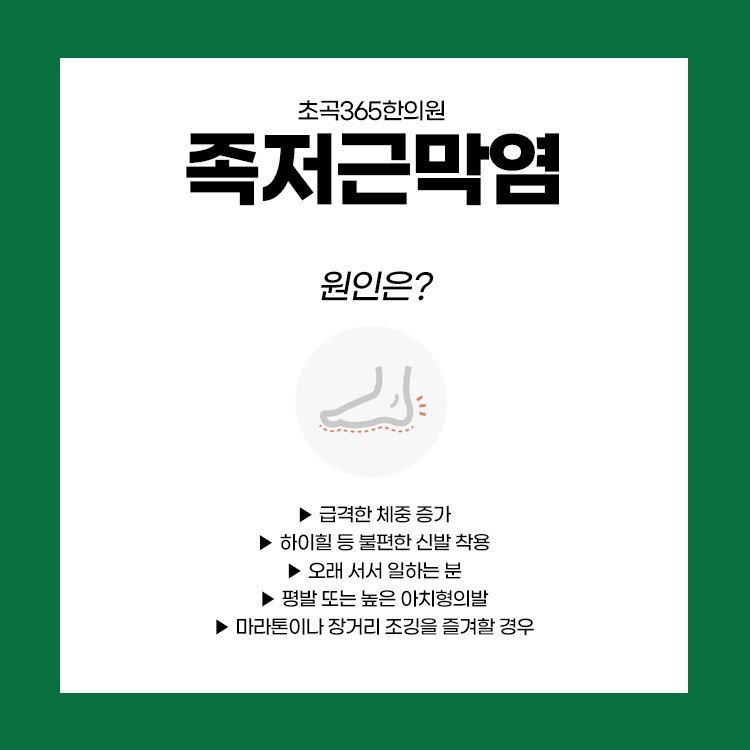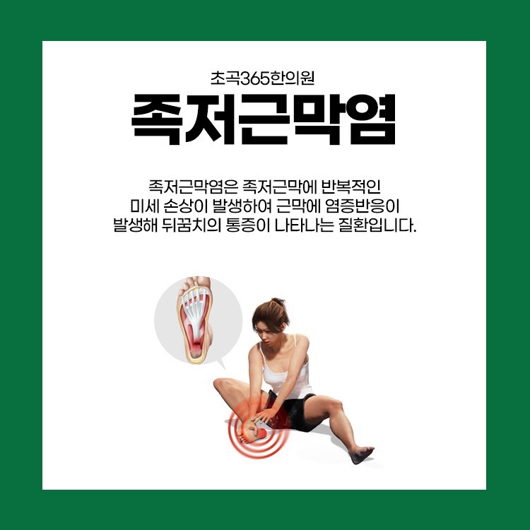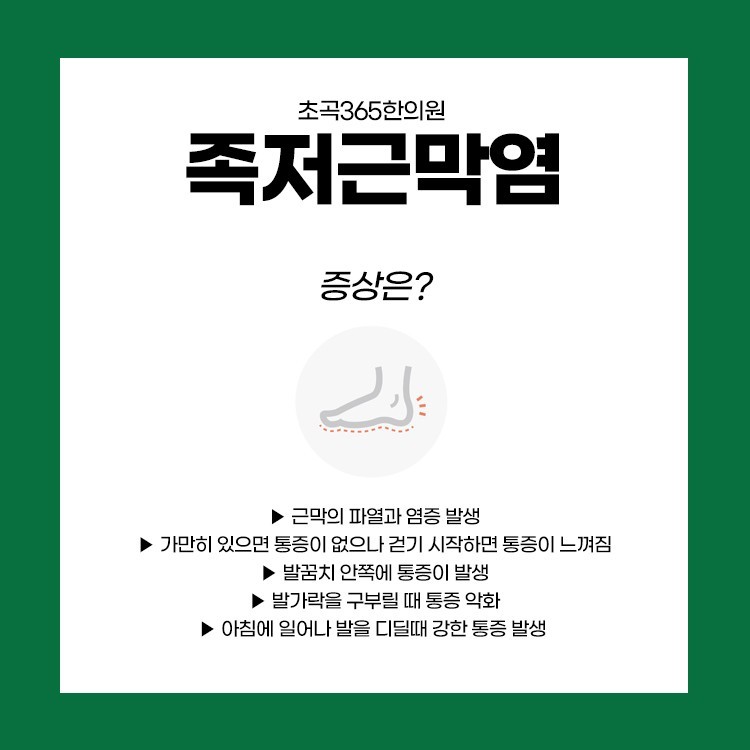 족저근막염은 족저근막이 반복적으로 미세 손상이 발생하게되면서 근막에 염증 반응이 나타나 뒤꿈치로 통증이 발생하게 되는 질환으로 흔히 나타나는 족부 병변 중 하나이기도 합니다. 증상에 대표적으로는 발뒷꿈치 통증, 압통, 통증이 점점 악화, 발 안쪽 통증, 보행 불편함 등이 있고 증상이 계속 나타나면 내버려 두시지 말고 초곡365한의원을 찾아주셔서 정확한 포항 발바닥통증 한의원 진단 그리고 검사를 받아보시기 바라겠습니다.