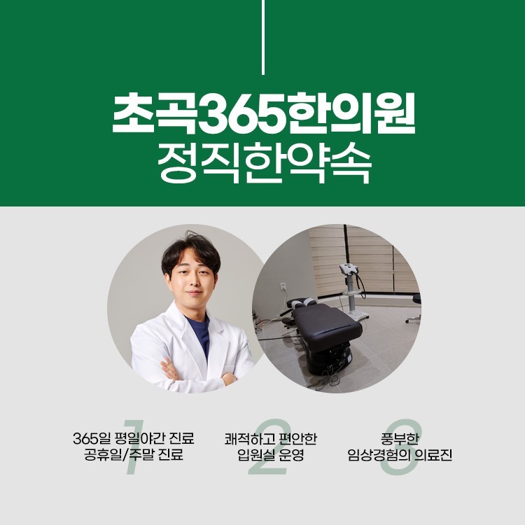 이 질환은 3개월~6개월까지 보존적인 치료가 중요하다고 할 수 있는데 보존적인 치료로도 개선 효과를 볼 수 있어서 꾸준하게 내원을 하고 적극적인 자세로 치료에 임해보시길 바라겠습니다. 초곡365한의원은 매일 평일에 야간 진료 그리고 공휴일과 주말에도 진료를 보고 있는데요.
