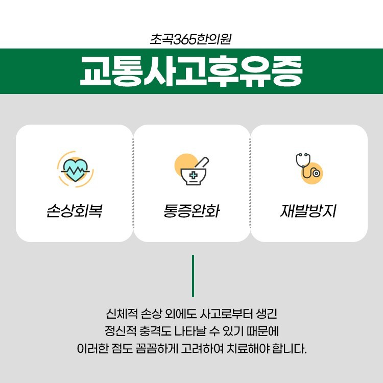 당장에 큰 증상이 보이지 않는다고 생각을 할 수 있겠지만 나중에는 다양한 문제들이 나타날 수 있어서 교통사고 치료는 빨리 방문을 해보시고 치료를 시작해주는 것이 중요하단 얘기를 해드릴 수 있겠습니다. 가볍에 여기는 일이 아니라는 것을 언제나 인지하면서 결과에 따른 치료를 진행해보세요.