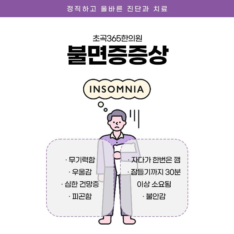 이러한 증상이 현재 내 상태와 비슷하다면 불면증이 아닌지 의심하시고 포항 불면증 한의원에 내원하셔서 치료를 진행하시길 바랍니다. 초곡365한의원에서는 환자분의 체질과 수면 패턴, 증상 등을 바탕으로 다양한 한방요법을 진행하고 있습니다. 한방치료를 통해 심신 안정과 수면 유도에 도움을 드리고 있습니다. 저하된 면역력을 높이며 몸과 마음을 건강하게 만듭니다.