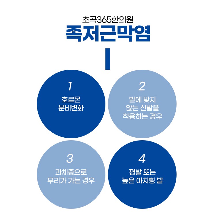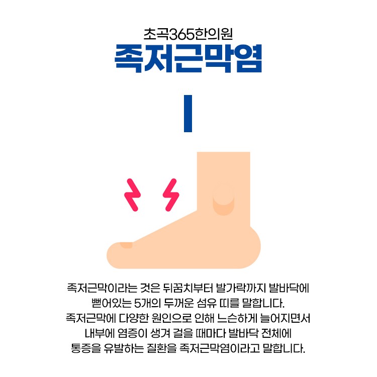 이런 족저근막에는 여러가지 원인으로 느슨히 늘어지게 되면 내부로 염증이 생기게 되면서 걸을 때마다 발바닥 전체로 통증을 일으키게 하는 질환이 족저근막염이라고 합니다. 평소에 오래 서서 일을 하는 직업, 평발이신 분들이라면 발바닥에 피로감이 많이 쌓이게 될 수 있으며 이를 더불어 오랫동안 걷기, 발에 안 맞는 신발을 착용하는 경우라면 족저근막에 계속 충격이 가해지면서 통증이 발생할 가능성이 높을 수도 있으십니다.