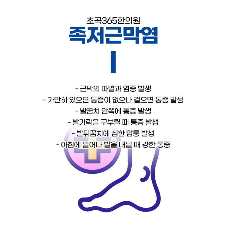 바늘로 찌르는 통증이 느껴지고, 발꿈치 안쪽 통증으로 느껴지는 경우가 많고 발바닥 전체가 찌릿거리는 느낌을 받으며 발바닥을 펴서 발가락을 하늘로 향하도록 하면 뻣뻣한 느낌도 들 수가 있습니다. 압통으로 인해 보행이 불편해질 수 있으며 염증이 심하지 않을 초기라면 걷게 될 수록 줄어드는데 만성으로 변하면 하루종일 심한 통증이 발생합니다.
