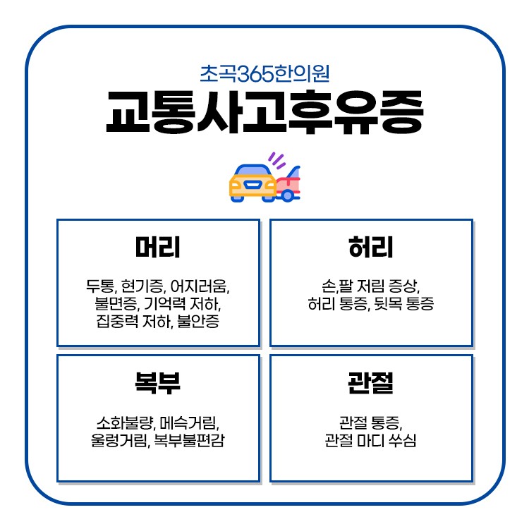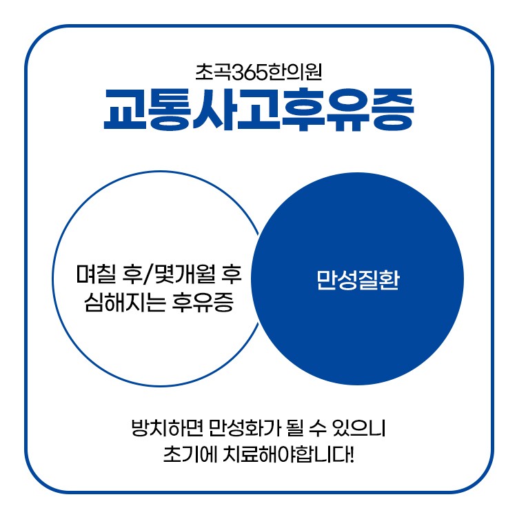 시간이 흐르면서 신체에 문제가 나타났을 땐 교통사고에 대한 후유증 가능성이 높을 수도 있지만 이를 알지 못하시는 경우도 많으십니다. 몸이 좋지 않아 발생하는 증사응로 생각을 하시기도 하는데 작은 이상징후가 느껴지신다면 초곡365한의원을 찾아주시는 걸 당부드려 볼 수도 있겠습니다.