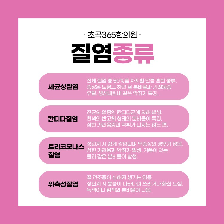질염 균에 따라 종류를 구분할 수 있으며 분비물 형태도 달라질 수가 있습니다. 세균성 질염은 질염의 약 50% 이상을 차지한다고 하며 증상이 없는 경우도 있습니다. 진균감염이란 칸디다성 질염은 곰팡이균 일종이며 칸디다가 원인이 되어서 덩어리진 분비물이나 심한 가려움이 틍징이기도 합니다.