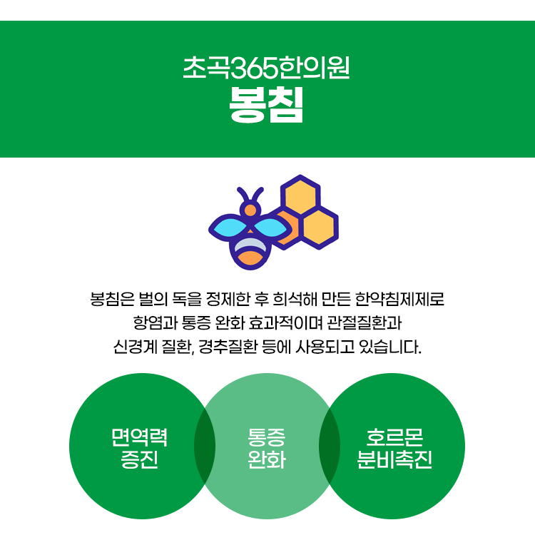 봉침치료는 벌의 독을 제거해서 희석을 하여 만든 한약침제제로서 통증 개선을 이루면서 관절 질환 및 신경계 질환과 경추 질환 등에 사용됩니다. 신체로 유해한 성분이 제거된 봉독액을 환지의 체질 및 질환별 농도를 조절하면서 사용을 하며 통증이 심한 부위로 투여하게 되는데요. 염증 개선, 면역력 증진, 원활한 혈액순환, 호르몬 분비를 촉진해보는데 큰 효능이 있다고 볼 수도 있겠습니다.