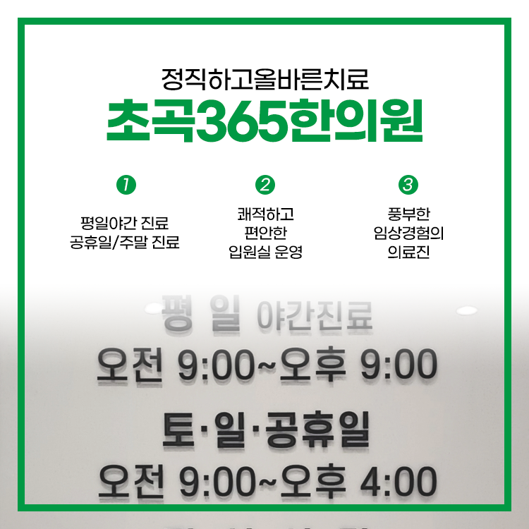 초곡365한의원은 이명에 대한 것들을 더불어 두통이나 소화장애 그리고 담적 및 과민성대장증후군과 안면마비, 척추관절통증, 한방부인과, 교통사고 클리닉 등의 다양한 진료 과목을 보고 있기 때문에 언제든지 도움이 필요로 하실 때에는 찾아주시면 되겠습니다.