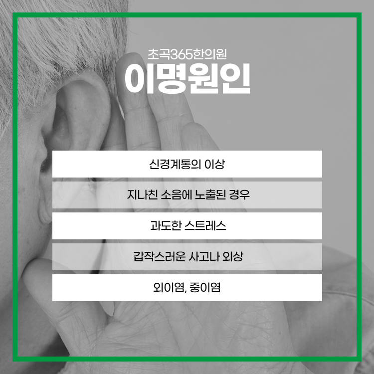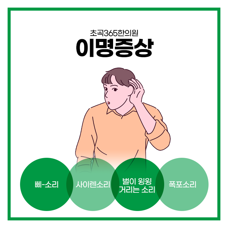 이명은 외부 소리 자각이 없는 상태에 소리를 인지하게 되는 현상이며 특별한 소리가 들리지 않아도 삐 거리는 소리가 들리는게 이명인데 스트레스를 많이 받으시는 분들이라면 한 번쯤은 겪어보셨을 증상일 것이라 생각하고 있습니다.