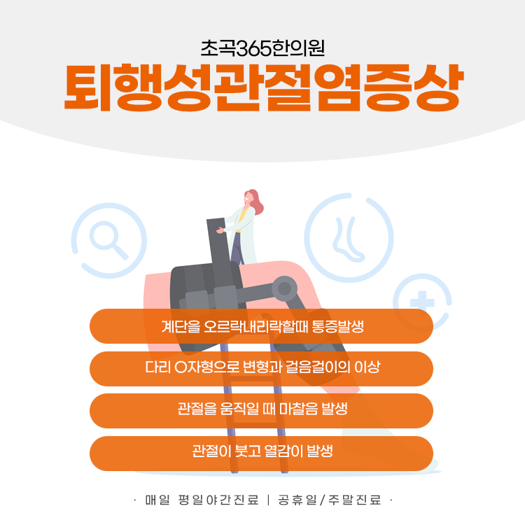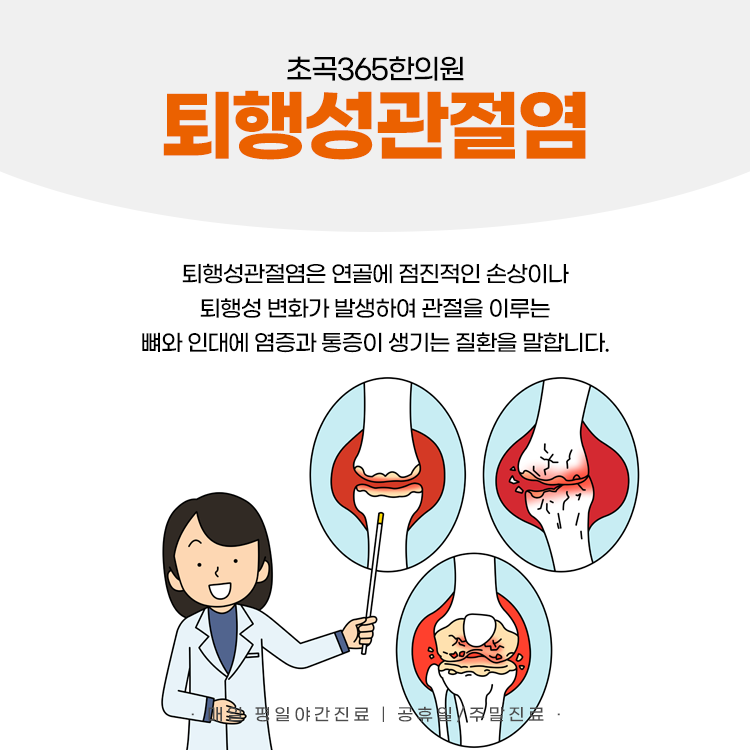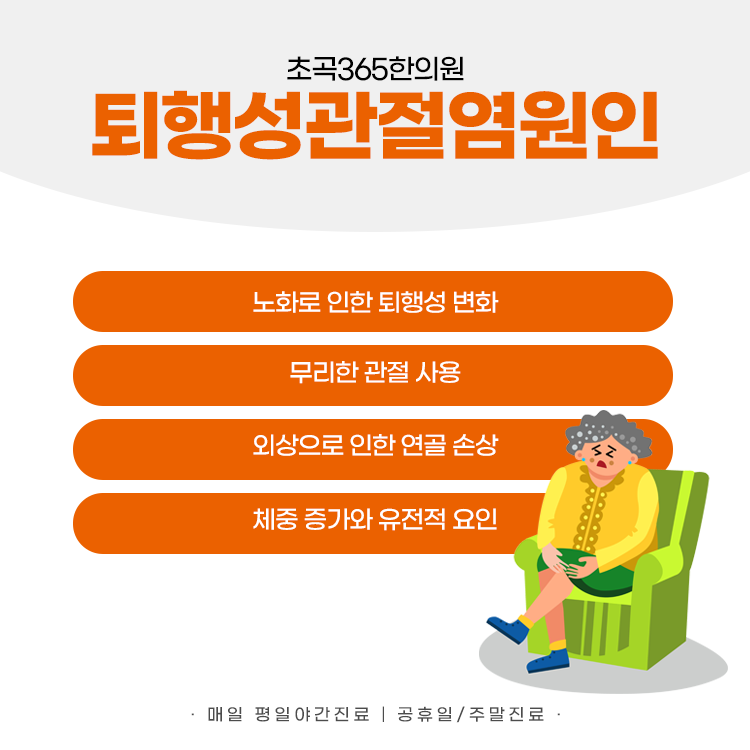 적합한 치료 시기를 놓치면 변형, 파괴 위험이 높으며 치료 과정에 어려움이 생길 수도 있는데 심한 경우 수술까지 고려를 해야 될 수 있으니 악화되기 전 진단과 치료를 받아보셔서 예방을 이루어보세요. 퇴행성관절염이 발생하는 원인은 외상에 의한 충격, 바르지 못한 자세, 생활습관에서 비롯되고 이를 더불어 근육 약화나 척추 이상 등으로 발생할 수도 있을 것입니다.