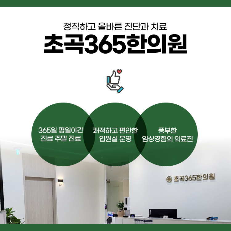 초기에 적합할 수 있는 관리를 시작해보신다면 호전을 해볼 수 있으나 치료 시기를 놓치게 된다면 이차질환 혹은 만성화로 진행될 수 있어 초기 대응을 놓치지 마시길 바라며 초곡365한의원에서 마련해드리고자 하는 한방치료로 후유증에서 벗어나보시길 바라겠습니다.