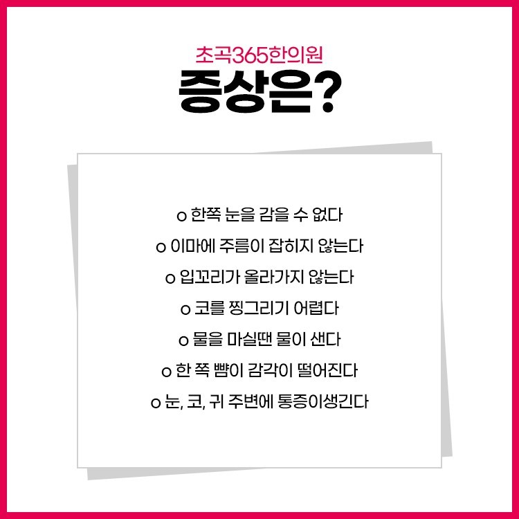 귀 이상증세와 표정을 짓는 것이 부자연스러우며 눈물 분비가 적어지게 되고 이마 주름이 잡히지 않을 수 있으며 눈을 감아도 감기지 않는 증상이 나타납니다. 잠 잘 때 눈이 감기지 않아 안구 건조증이 동반될 수도 있으며 입이 마음대로 움직이지 않아서 식사가 어려워지기도 하는데 이렇게 일상으로 밀접한 관계가 있어서 더욱 불편함을 호소하시기도 합니다.