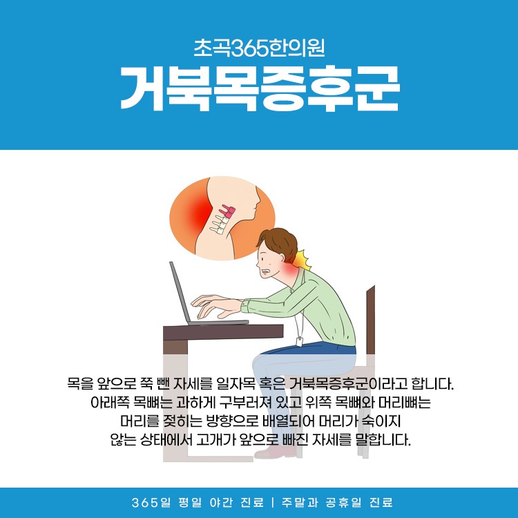 그러나 적합한 포항 거북목치료 한의원 치료가 진행이 되었어도 생활 습관을 교정해주지 않으면 안될 것인데요. 평소에 생활 습관을 의식하면서 교정을 해주는게 빠른 회복에 도움이 될 것입니다. 환자분들 한 분 한 분 정성을 다해 치료를 진행하도록 하는데요. 평일에는 물론 토요일, 일요일, 공휴일도 쉼 없이 진료를 보고 있기에 도움이 필요한 분들께서는 내원을 해보시길 바랍니다. 감사합니다.