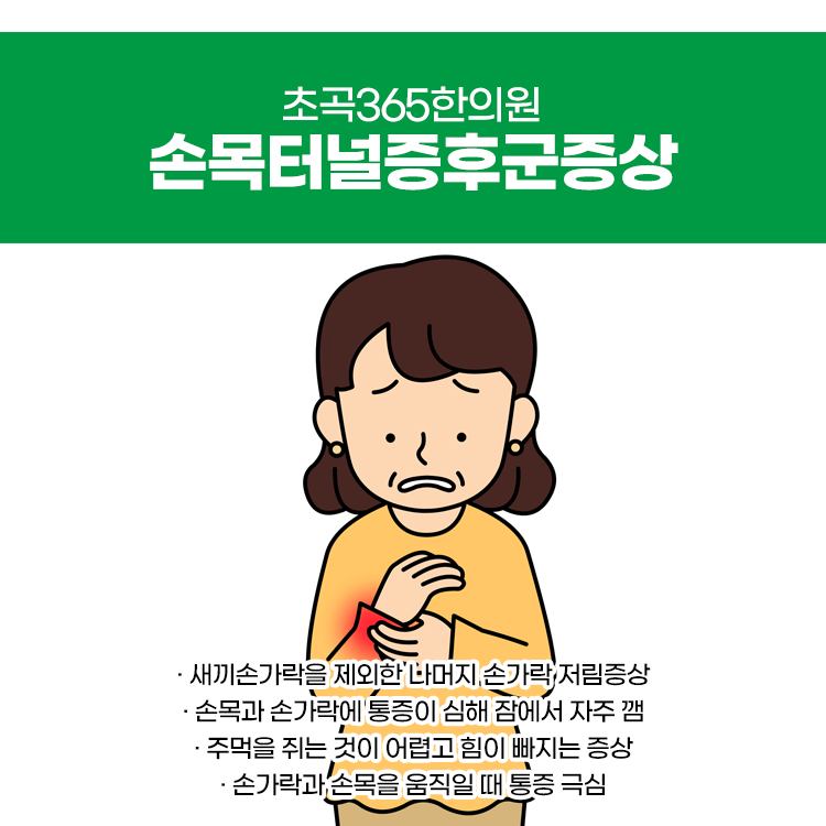 손목터널증후군의 증상에는 손목을 사용하면서 통증이나 감각 이상증세가 발생하고 주먹을 쥐면 통증이 극심해질 수 있습니다. 힘을 주면 손목에 힘이 들어가지 않고 바느질, 연필 쥐는 등의 섬세한 작업 시 불편함과 어려움을 느낄 수 있습니다. 아침에 일어나면 손가락이 뻣뻣해서 잘 구부러지지 않으며 손목이나 손목 주변의 통증으로 고통이 지속될 수 있습니다.