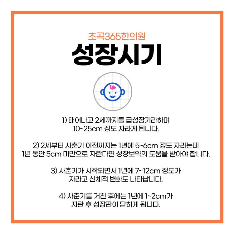 태어나고 2세까지를 급성장기라고 하는데 이때 10~20cm 정도가 자라납니다. 2세부터 사춘기 이전에는 꾸준한 성장을 보이는데요. 1년에 5~6cm 정도 자라나게 되는데 1년 동안 5cm 미만으로 자라면 도움을 받아보셔야 됩니다. 사춘기가 시작되면서 1년에 7~12cm 정도가 자라고 신체적인 변화도 생기는데요. 이렇게 사춘기를 거친 이후에는 1년에 1~2cm가 자라 성장판이 닫힙니다.