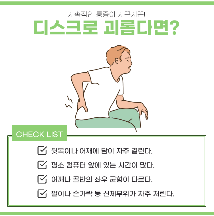 추간판 탈출증은 주로 생활습관이 좋지 않은 20대부터 급성으로 발병하는 경우가 많습니다. 눕거나 앉아 있을 때 통증이 심해지는 경우가 많은데요, 주로 다리나 허리등 하반신부터 저릿거리고 당기는 듯한 느낌을 호소하게 됩니다. 반면 척추관협착증은 40대에 서서히 진행되는 경우가 많다고 합니다. 앉거나 누울 때에는 그렇게 아프지 않지만, 양쪽 다리가 터질 것 같은 통각 증상이 확인되며 저릿거리기도 합니다. 두 질환은 유사하기 때문에 혼동하는 경우가 많습니다. 따라서 지금 내 상태를 제대로 파악할 수 있도록 포항 초곡 365 한의원에서 검사를 받아보시는 것을 추천드립니다.