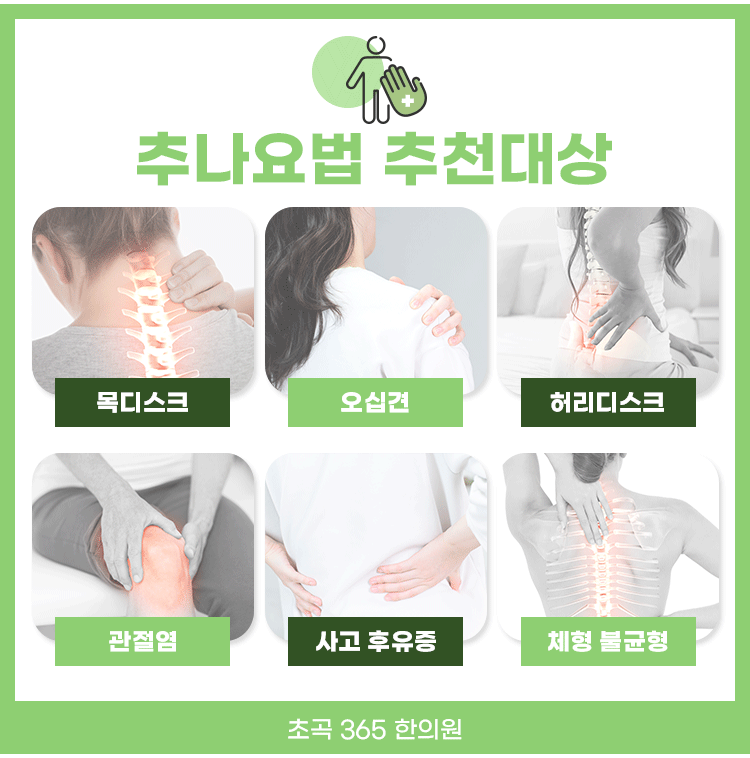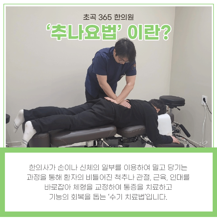 추나요법은 추간판 탈출증, 척추측만증 및 협착증을 개선하는 데에 탁월한 효과를 보입니다. 또한 아이들의 성장 및 발육에도 도움을 주기도 합니다. 경직된 근육을 풀면서 바른 자세를 되찾을 수 있도록 신체 밸런스를 맞추는 것이 가장 큰 장점이며, 개인의 체형을 고려하여 한의사선생님께서 손과 신체를 이용해 밀고 당기면서 진행을 하기 때문에 안심하실 수 있어요.