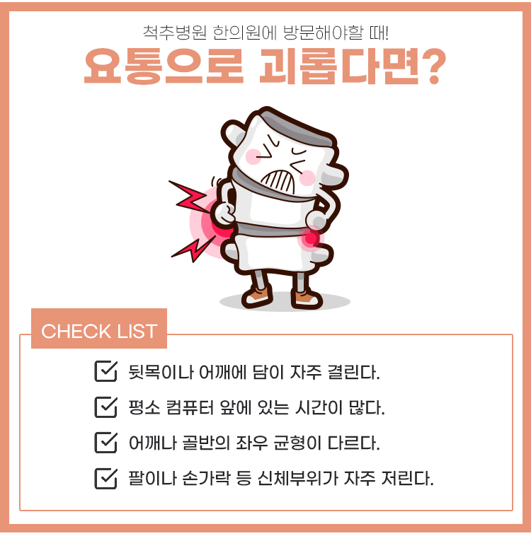 운동을 한 후, 몸을 많이 사용한 후의 근육통에 의해서 생긴 허리통증은 충분한 휴식을 통해서 증상이 완화된다지만, 척추질환이나 허리디스크, 목디스크에 의한 통증은 적절한 시기에 치료받지 않게 된다면 만성통증을 유발할 수 있어 주의가 필요합니다. 그렇기 때문에 척추병원 한의원인 초곡365한의원에서 빠른 상담을 통해 정확하게 원인을 파악하고 치료를 받으시는 것을 권해드리는데요, 장시간 책상 앞에 앉아서 근무를 하시는 직장인분들부터 스마트폰을 자주 보거나 활발한 운동을 즐겨하는 젊은세대들도 요즘엔 디스크의 위험이 높기 때문에 절대 문제를 방치하지 않으시는 것이 좋습니다.