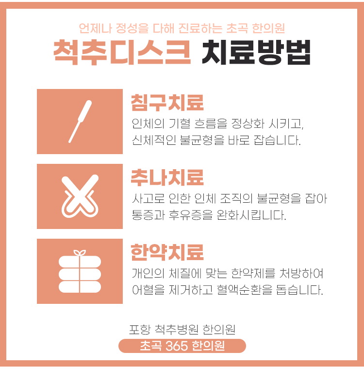 평소 생활할때 자기 자신이 어떠한 자세를 취하고 있는지 생각해보면 대부분의 사람들은 바르지 못한 자세를 취한다는 것을 금방 알 수 있으실텐데요. 목을 앞으로 숙이거나 길게 쭉 빼 내미는 자세, 허리를 구부정하게 내린채 척추에 무리를 주는 행동들이 고착화 될 경우 목이나 허리디스크의 발병률은 더욱 높아지기 때문에 더 늦지 않도록 하루라도 빨리 바른 자세와 습관을 유지하기 위한 노력을 이어가시는 것이 좋습니다. 또한 포항 척추병원 한의원인 초곡 365 한의원과 함께 내 체질에 맞는 다양한 한방치료를 통한 관리를 시작하시는 것이 좋으니 빠르게 내원하셔서 현재의 내 상태를 파악하고 그에 맞는 치료를 받으신다면 통증 완화에 많은 도움을 받으실 수 있습니다.