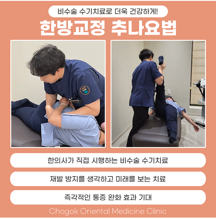 포항 척추병원 한의원인 초곡 365 한의원에서 허리디스크나 목디스크, 척추통증을 치료하기 위해 진행하는 추나치료는 한의사 선생님께서 직접 신체부위나 손을 이용하여 밀고 당기는 방법의 수기요법인데요. 먼저 환자의 근육을 이완시킨 후에 틀어진 관절이나 근육에 순간적인 힘을 가하여 제자리를 찾아주는 치료방법으로 비대칭 관절이나 근육의 치료에 많은 도움을 주며 즉각적인 효과를 보실 수 있습니다. 하지만 평소의 생활습관이 제일 중요한 요소로 작용하기 때문에 초곡한의원의 한방치료를 진행함과 동시에 본인의 평소 생활습관 개선을 꾸준하게 이어가시면서 더이상은 이러한 척추 통증에 관한 문제들이 생기지 않도록 조심하시는 것을 인지해주시고 비수술적 치료의 중요성에 대해서도 한번 더 생각해주시면 좋겠습니다.