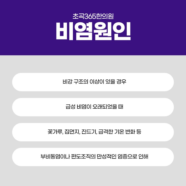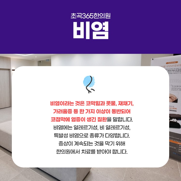 비염이라는 것은 코막힘과 콧물, 재채기, 가려움증 등 한 가지 이상이 동반되어 코점막에 염증이 생긴 질환을 말합니다. 비염에는 알레르기성, 비 알레르기성, 특발성 비염으로 종류가 다양합니다. 이러한 비염을 유발하는 원인은 꽃가루와 집 먼지, 진드기 등이 대표적이며 이 외에는 동물의 털 등이 있습니다.