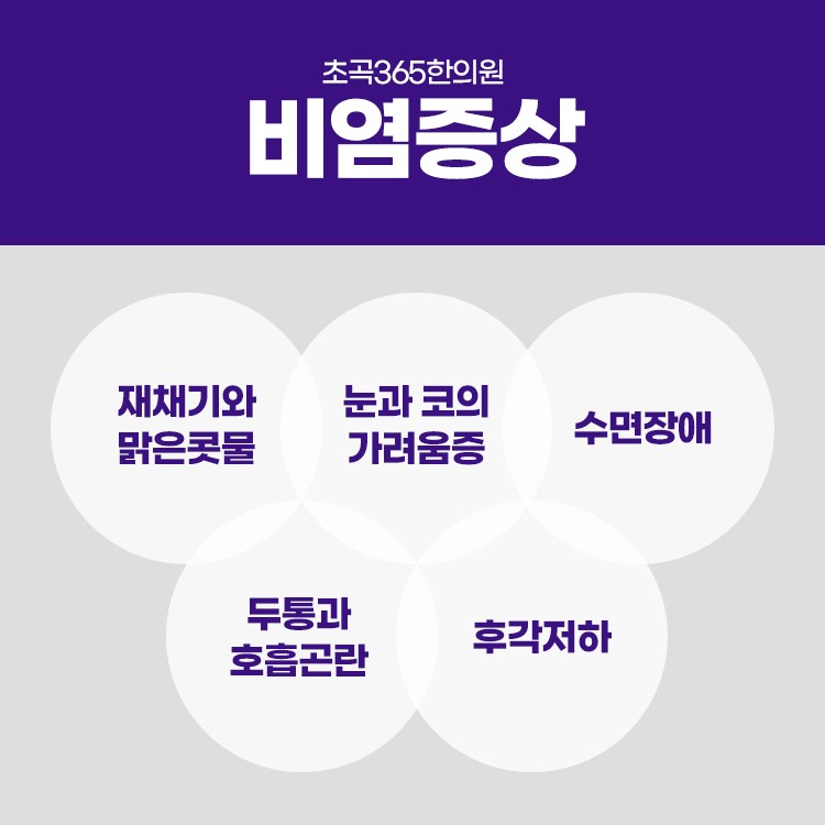 만성 비염은 콧물과 가려움, 재채기, 코막힘 등이 있는 염증성 질환입니다. 만성비염은 급성비염이 지속되면서 반복되는 경우가 만성으로 변하게 됩니다. 이렇게 다양한 요인들로 인해 발생하는 질환은 증상 또한 다양합니다. 대표적인 증상은 재채기, 코막힘, 맑은 콧물 등이 있으며 숨쉬기가 불편하고 두통이 극심해집니다.