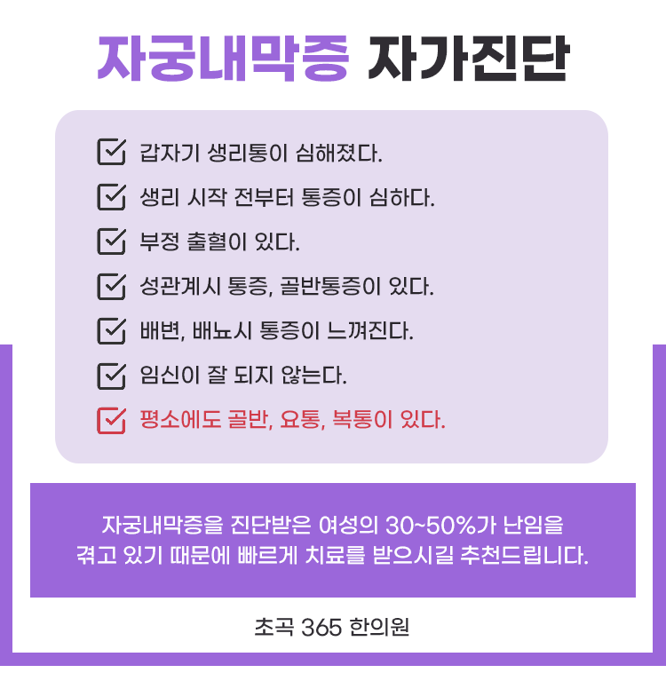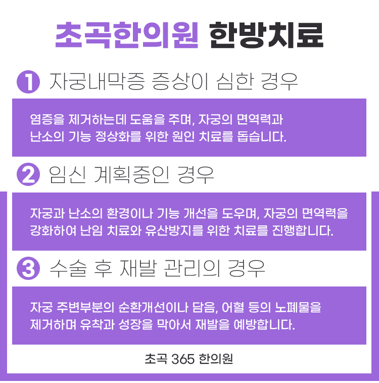 그러한 분들은 특별히 신경 써서 건강을 챙기는 것이 자궁내막증이 다시 발생할 확률을 낮추는 행동이며. 계속 관리가 없으면 혈류 순환에 방해를 받아서 자궁 내막이 성장하는데 안 좋은 영향을 주게됩니다. 결국에는 월경이 시작할 때가 되어도 자궁 내막이 탈락되는 과정조차 발생하지 않아 자궁의 상태를 점점 악화시키게 됩니다. 문제를 지속해서 방치하면 결국 이차적인 질환까지 이어지는 상황도 발생하게 되며. 해당 부위에 염증이 발생할 확률이 있고, 이런 원인들이 합쳐져서 난임과 유산을 야기하게됩니다. 안 좋은 상태가 자주 발생한다면 여러 가지의 질환을 생각해 보고 초곡 365 한의원에서 정확한 진단과 관리를 받으시는것이 현명한 방법입니다.