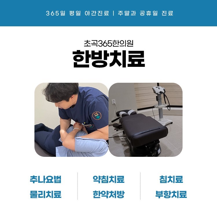 초곡365한의원에서는 교통사고로 인한 후유증을 체계적인 치료 계획을 통해서 수립하는 것 뿐만 아니라 여성질환이나 근골격계 질환, 호흡기 질환 등 다양한 진료 과목을 도와드리고 있으며 평일 매일 9시까지 야간진료를 하고 있습니다. 공휴일과 주말 진료 역시 진행을 하고 있는데요.