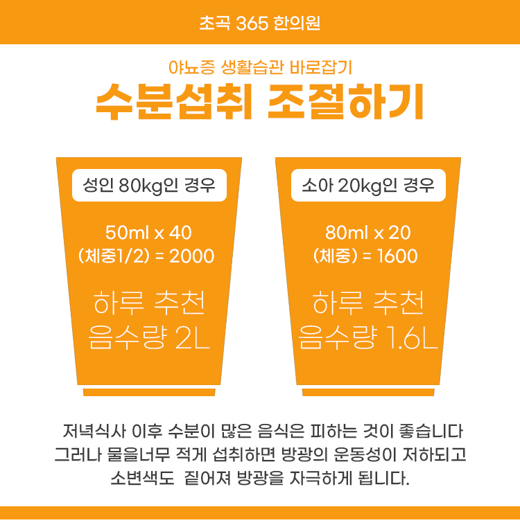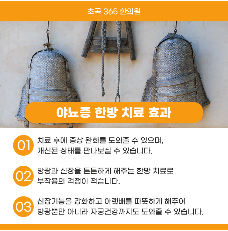 그 외에는 요로의 기능저하로 빈뇨나 야간뇨 요절박뇨나 절박성 요실금증으로 고생하시는 갱년기 이후의 어르신들이 성인야뇨증과 야간빈뇨로 고생하시는 경우도 많이 볼 수 있으며, 한의학에서는 성인야뇨증뿐 아니라 소아의 야뇨증도 체질의 허약이나 신경의 예민함으로 발생할 수 있다고 보고 있습니다. 물론 대부분의 성인야뇨증 야간빈뇨증상은 뚜렷한 원인을 찾기 힘들때가 많습니다. 반면, 한방에서는 성인야뇨증의 원인을 스트레스로 인한 화(火)와 함께 하체의 양기가 부족해지며 생기는 증상으로 보고 있습니다. 그래서 포항 야뇨증치료 한의원 초곡 365 한의원에서는 스트레스로 생긴 화는 낮추고 마음을 편안하게 하는 한편 하복부의 양기를 돕고 , 방광과 신장의 기능을 돕는데 초점을 맞춰 성인야뇨증 치료를 돕고 있습니다.