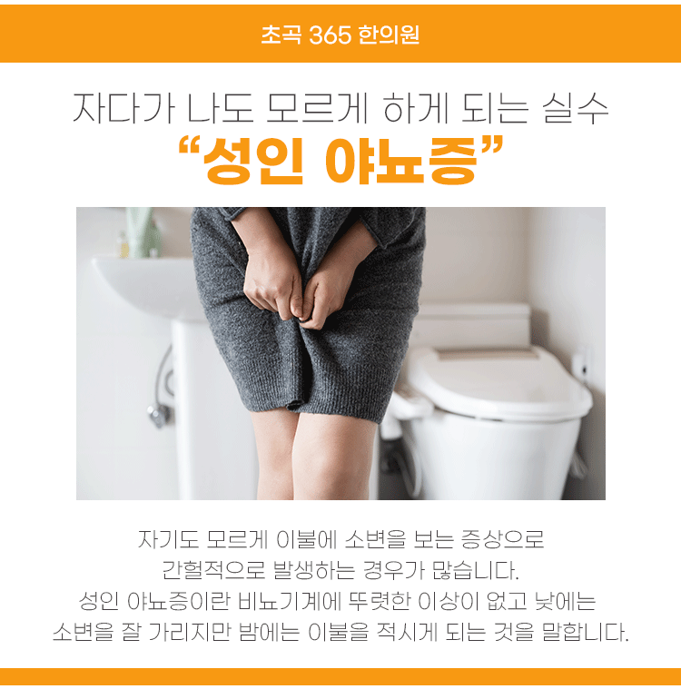 그렇다면 오늘은 야뇨증의 원인과 치료법에 대해서 포항 야뇨증치료 한의원 초곡 365 한의원과 함께 자세히 알아보도록 하겠습니다. 성인야뇨증 야간빈뇨증상이란 어떻게 나타날까요? 일반적으로 성인이라면 400~500ml 정도의 소변이 차기 전까지는 크게 요의를 느끼지 않으며, 하루 4회 정도의 소변을 보는 것이 보통입니다. 하지만 성인야뇨증이란, 비뇨기계에 특별한 이상이 없고 낮 동안에는 소변을 잘 가리다가 밤에만 오줌을 지리는 것을 말합니다. 보통 단독으로 나타나는 경우가 드물고, 절박뇨 및 요실금 등의 배뇨장애와 동반한다는 특징을 가지고 있습니다.
