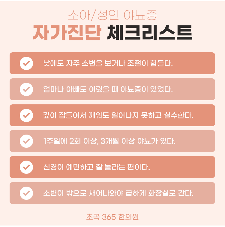 야뇨증의 원인으로는 여러 가지가 있지만 심리적인 요소를 빼놓을 수 없다고 합니다. 방광 질환을 가지고 계신 분들과 마찬가지로 배뇨장애가 낮에 발현하게 되고, 밤 시간대에도 일어나게 되거나 실수를 할 것만 같아서 긴장하게 되면서 심리적으로 예민한 상태가 오래 이어질 수 있으므로 전반적인 상황을 파악하면서 심리적인 안정을 취할 수 있게 케어하는 것이 좋습니다. 그렇다면 포항 야뇨증 한의원 초곡 365 한의원과 함께 성인 야뇨증 진단 기준을 알아보겠습니다. 만약 최근 6개월~1년 동안 1~2회 이상 소변 실수를 하셨다면 야뇨증일 가능성이 큰데요, 처음에는 소변을 보고 싶은 욕구가 갑자기, 심하게 드는 급박뇨가 시작되고, 어느 순간부터는 나도 모르게 수면 중 소변 실수를 하게 됩니다. 자다가 실수를 할까봐 화장실을 드나들고, 잠자리가 바뀌는 것이 두려워 가족, 친구들과 여행 가기가 꺼려진다면 포항 야뇨증 한의원 초곡 365 한의원에서 치료가 필요한 상태일 수 있습니다. 일반적으로 성인 100명 중 5명은 성인 야뇨증을 경험하고 있다고 합니다. 그러니 부끄럽다고 병을 키우지 마시길 바랍니다. 소아 야뇨증은 5세 이후, 1달에 1~2번 이상의 빈도를 기준으로 하지만, 성인 야뇨증은 6개월에 1~2회 정도를 기준으로 합니다.