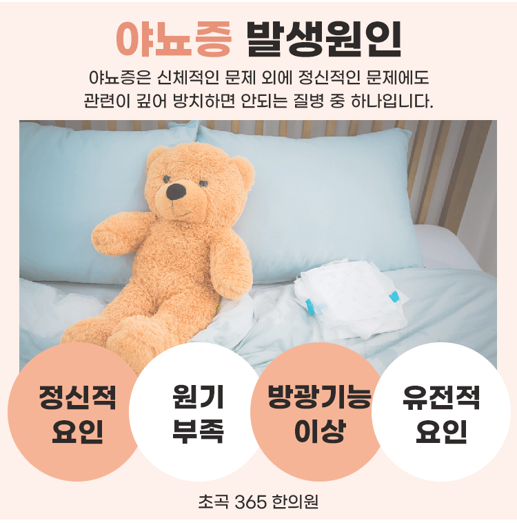 정서적인 불안정이 겹치면서 배뇨장애를 호소할 수 있게 되고, 밤은 물론이고 낮에도 비슷한 징후가 드러나고 있으니 일상 생활에 큰 스트레스를 안겨줄 수 있는 야뇨증. 그렇기 때문에 한의학적 대처를 통해서 약해진 기운을 높여주고 몸도 마음도 안정화 시켜주는 것을 추천드립니다. 초곡 365 한의원에서 방광의 기능을 증진하면서 외부의 인자에 대항하는 힘을 길러주는 치료를 통해 내게 맞는 한방 치료를 진행하면서 내 몸을 더욱 건강하게, 또 활기찬 일상을 되찾아가시길 바랍니다.