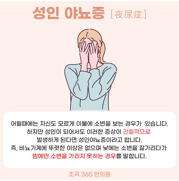 산부인과나 비뇨기과를 가도 뚜렷한 원인을 찾을 수 없는데, 수면 중에만 오줌을 지리는 것을 바로 야뇨증이라고 합니다. 야뇨증은 신기하게도 낮에 일상생활을 하는 동안에는 이런 증상이 잘 나타나지 않습니다. 야뇨증은 소변 교육을 하는 어린아이에게 나타나기 쉽고, 청소년이 되면 자연스레 사라지지만, 일부에서는 성인기에도 나타나게 되며, 갑자기 없던 증상이 생기기도 합니다. 이를 성인 야뇨증이라고 얘기합니다. 성인 야뇨증은 대개 신체 기능이 약해지는 고령층에서 흔하지만, 현대에 와서는 젊은 성인층 환자도 꾸준히 발생하고 있습니다.