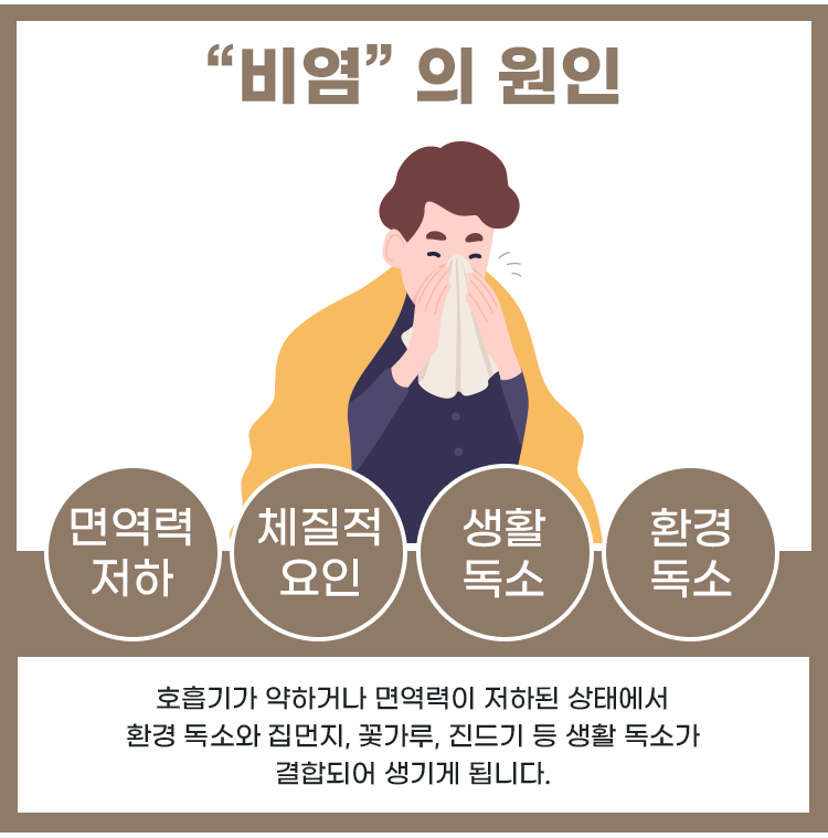 비염이라고 하는 질환은 비강을 덮고 있는 점막에 염증이 발생하게 되는 것을 이야기합니다. 그렇기 때문에 비염이 발생하게 되면 여러 가지 불편한 증상이 나타나게 됩니다. 비염은 크게 급성과 만성 위축성으로 비염으로 구분하고 있는데요. 만성 비염 같은 경우에는 크게 감염성이나 비감염성으로 구분합니다. 만성 감염성 비염은 세균에 의해서 발생하는 비염을 말하고 있습니다. 만성 비염은 급성 비염이 제대로 개선되지 않거나 여러 번 반복적으로 발생하게 되면서 발생할 수도 있으며 부비동염이나, 편도선, 염증 등으로 인하여 영향을 받을 수도 있고, 전반적인 신체 영양이 불규칙하거나 균형을 이루지 못하여 나타나는 경우도 많이 있습니다.
