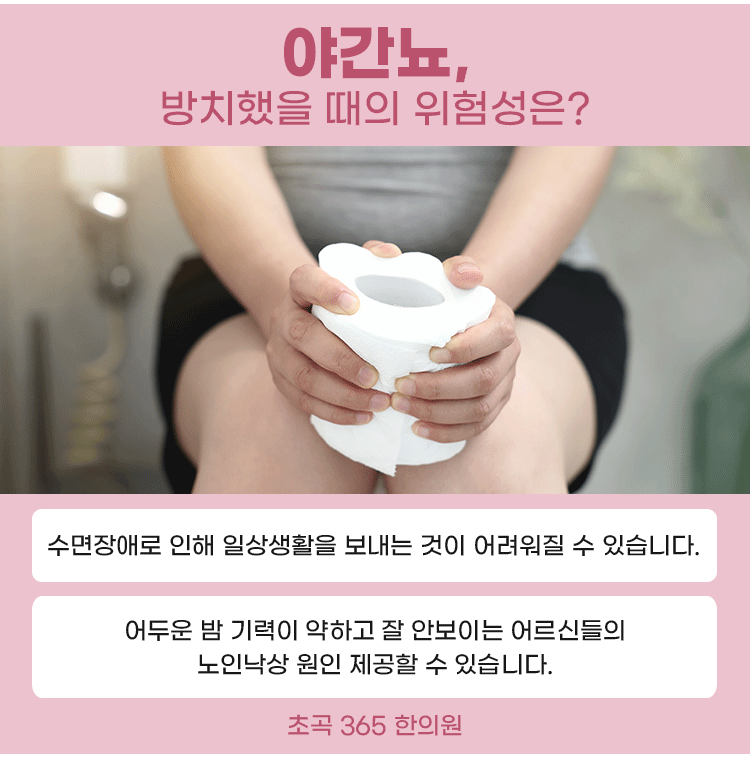 야간뇨는 수면의 질을 저하시키기에 매우 불편한 질환입니다. 매일 밤마다 단잠이 방해를 받으니 아침에 기상이 힘들며, 낮에 피곤이 몰려와 일상적인 활동에 지장을 받는 경우가 많습니다. 또한 위험한 질환이기도 한데요, 그 이유로는 노인 낙상의 원인을 제공하기 때문입니다. 어르신분들의 경우 밤 늦게 잘 안 보이고 기력도 떨어진 상태에서, 화장실을 자주 가다 보면 넘어지면서 골절상을 입거나 크게 다치시는 경우도 있습니다. 야간뇨는 배뇨장애를 겪으시는 분들의 가장 대표적인 증상 중 하나라고 합니다. 깊은 수면에 빠져있다가도 시간에 상관없이 소변을 보고 싶어 2회 이상 깨는 증상이 반복되고 있다면 포항 야간뇨 한의원 초곡365한의원의 도움을 받으시는 것이 좋습니다. 야간뇨는 젊은 학생들에게도 나타날 수 있지만 대부분 성인에게 자주 발생하고 나타나는 질환입니다. 증상이 심각할수록 피로감 뿐만 아니라 스트레스가 심해져 일상에서 제대로 된 업무를 보지 못하는 등 정신적으로도 많은 영향을 미치기 때문에 참거나 고민하지 마시고 치료를 받으시는 것을 추천드립니다.